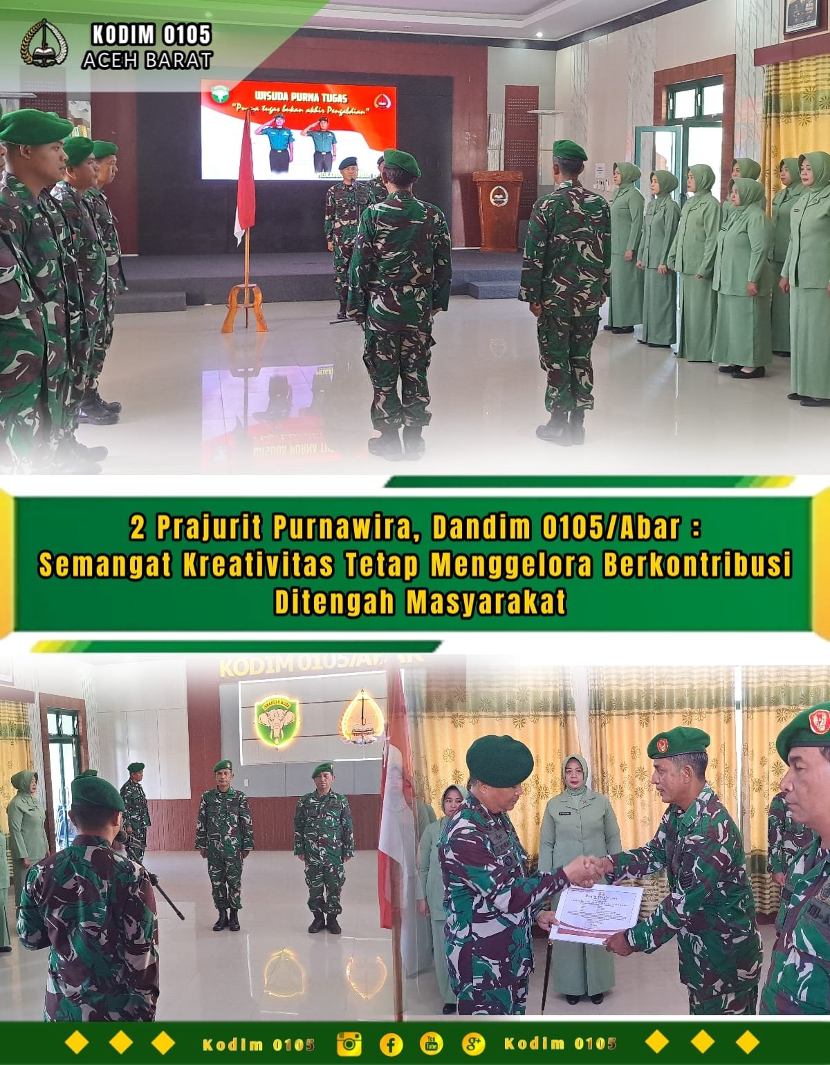 ACEH BARAT – Dandim 0105/Abar Letkol Inf S. Kembaren, S.E., M.I.P., CFrA., memimpin upacara tradisi wisuda purnawira/pensiun 2 (dua) prajurit yang digelar di Aula Makodim setempat, Jalan Imam Bonjol, Desa Drien Rampak, Kecamatan Johan Pahlawan, Senin (2/2/2026).