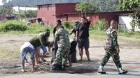 Nampak personil TNI dan peserta bersih-bersih sungai saling bersinergi, bekerja sama membawa sejumlah peralatan membersihkan tanaman liar dan memungut sampah di seputaran sungai.