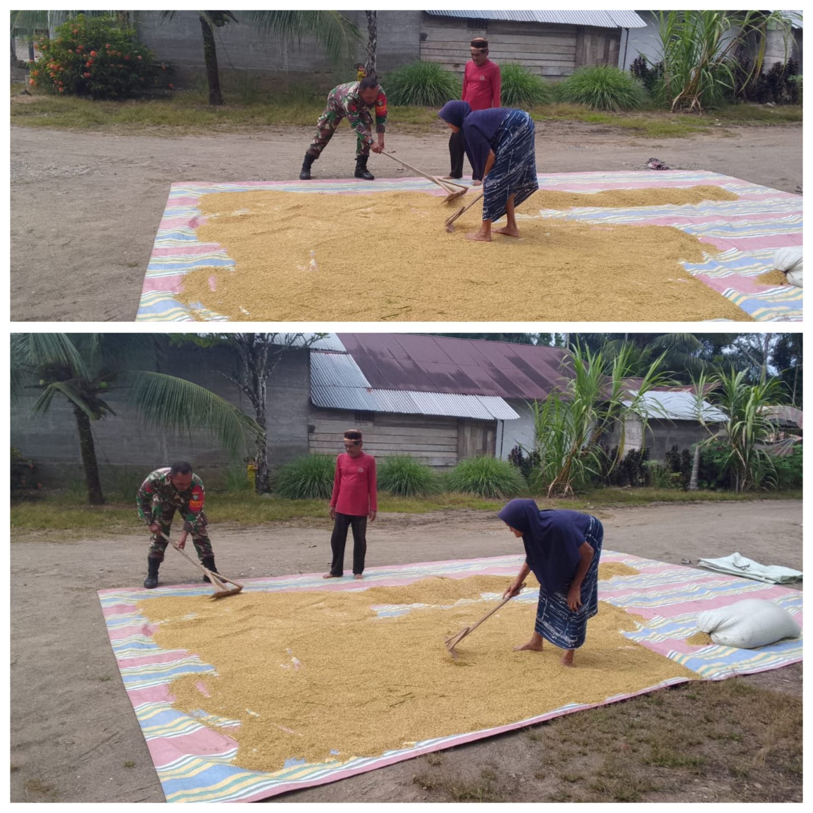 ACEH BARAT – Wujud kepedulian terhadap masyarakat terus ditunjukkan oleh aparat kewilayahan. Seperti yang dilakukan Babinsa Koramil 0105-10/Woyla Barat, Kodim 0105/Aceh Barat, Kopka Roni Gunawan yang turut membantu warga menjemur padi hasil panen.