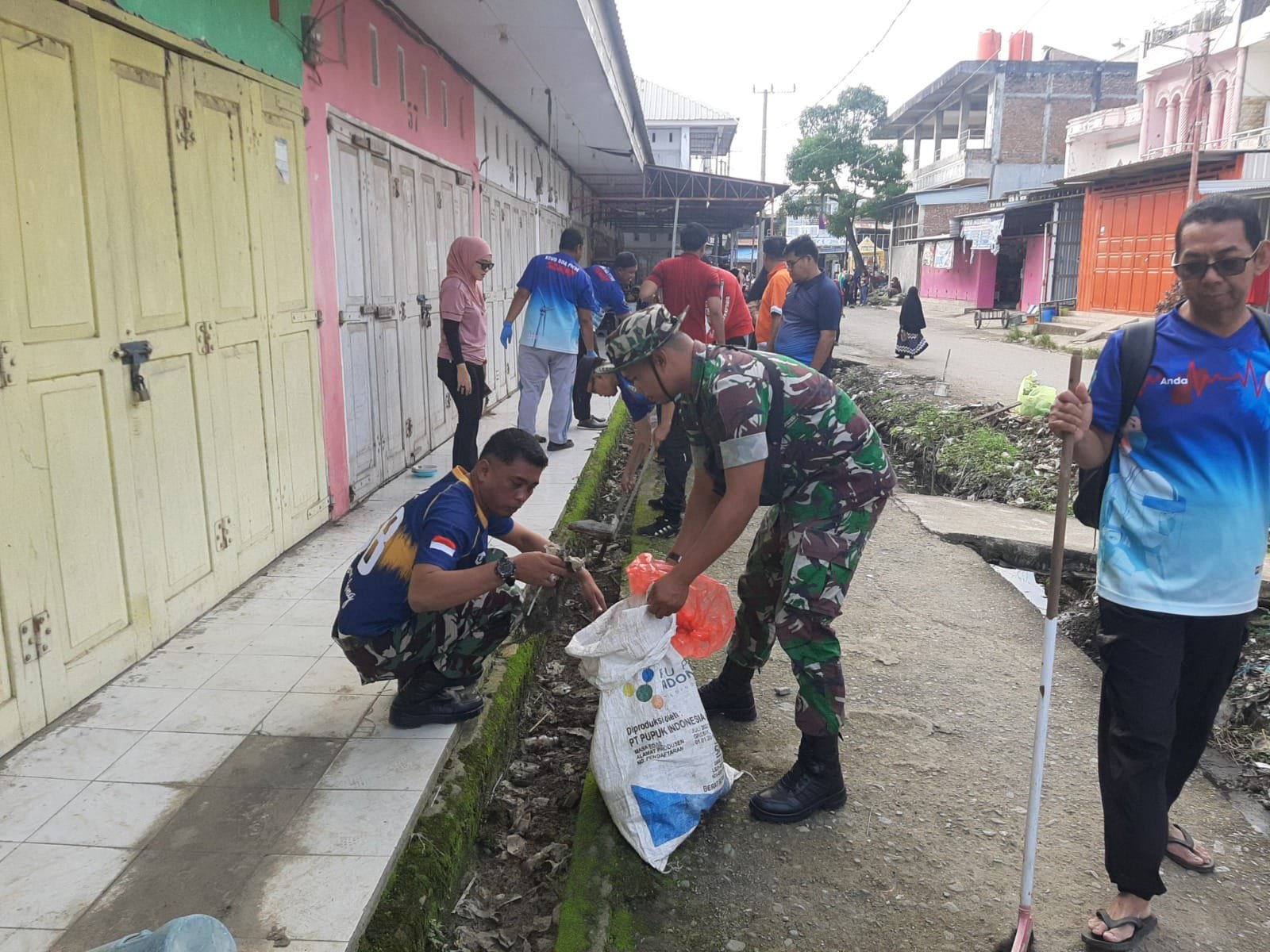 Personel Koramil yang dipimpin langsung oleh Bati Tuud Ramil 05/Dua Pitue Pelda Rusdi membawa alat pembersih seperti sapu, penyedot sampah, dan ember untuk membersihkan berbagai area di pasar. Mereka fokus membersihkan lorong-lorong, area parkir, saluran drainase, serta menyapu dan mengumpulkan sampah yang menumpuk di sekitar kios pedagang. Beberapa pedagang dan warga sekitar juga turut serta bergotong royong dalam kegiatan ini.