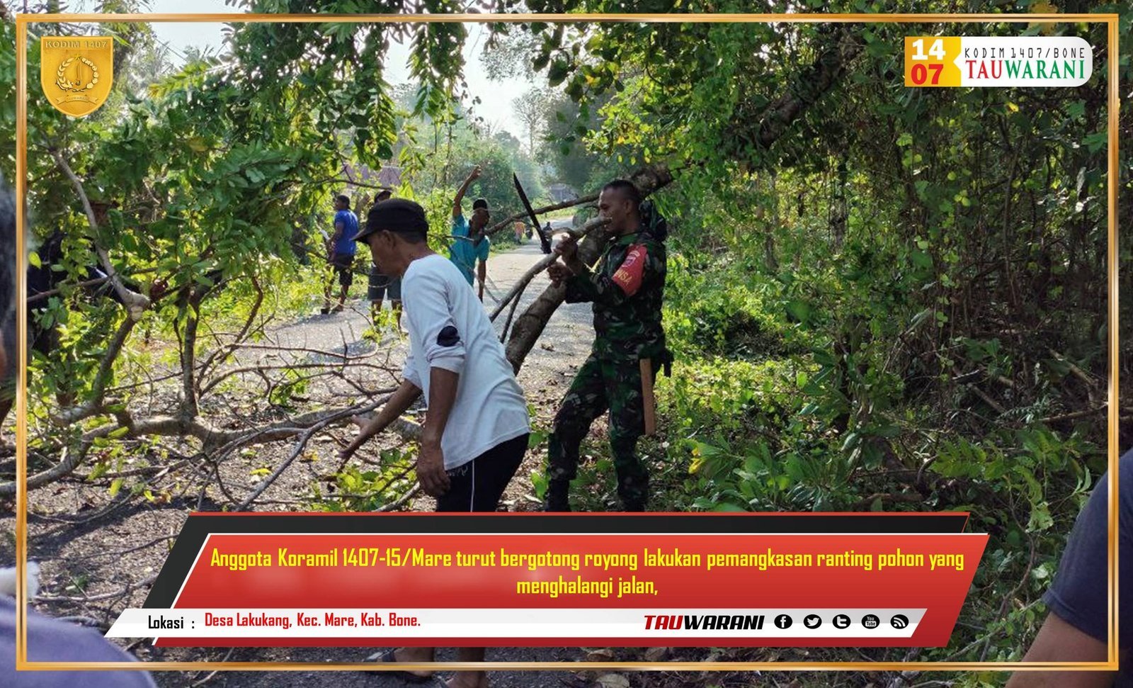 Bone – Anggota Koramil 1407-15/Mare bersama warga bergotong royong melakukan pemangkasan ranting pohon yang menghalangi jalan di Desa Lakukang, Kecamatan Mare, Kabupaten Bone, Selasa (11/02/2025).