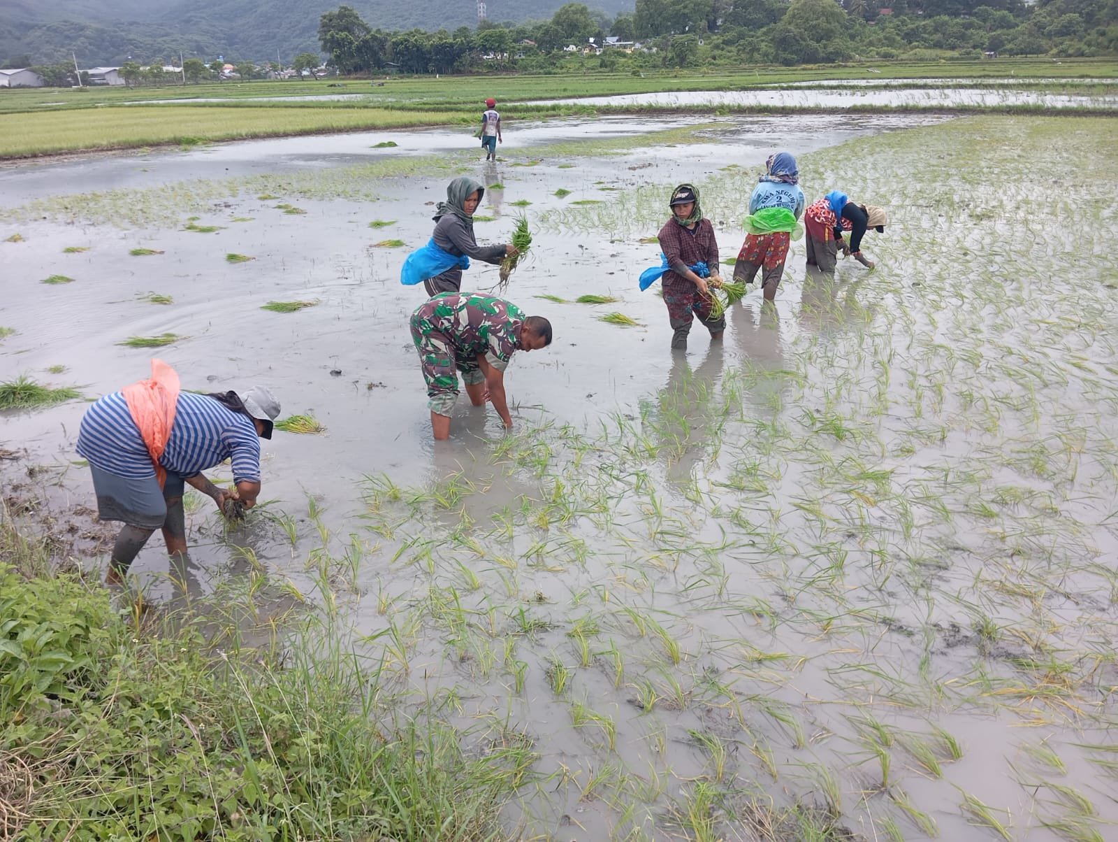 Kegiatan ini merupakan bagian dari pendampingan Babinsa kepada petani, guna mendukung peningkatan hasil pertanian sekaligus mempererat kemanunggalan TNI dengan rakyat. Dengan penuh semangat, Serka Paulus bersama para petani menanam bibit padi secara bergotong royong di lahan persawahan milik warga.