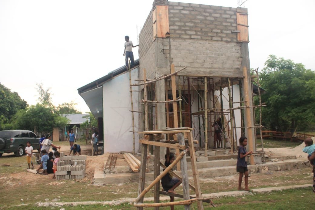 Saling bahu membahu anggota satgas TMMD ke-123 kodim 1601/Sumba Timur lanjutkan pemasangan batako Menara Gereja GKS Hanggaroru di desa Kaliuda, Kecamatan Pahunga Lodu, Kabupaten Sumba Timur. Sabtu (15/03/2025)