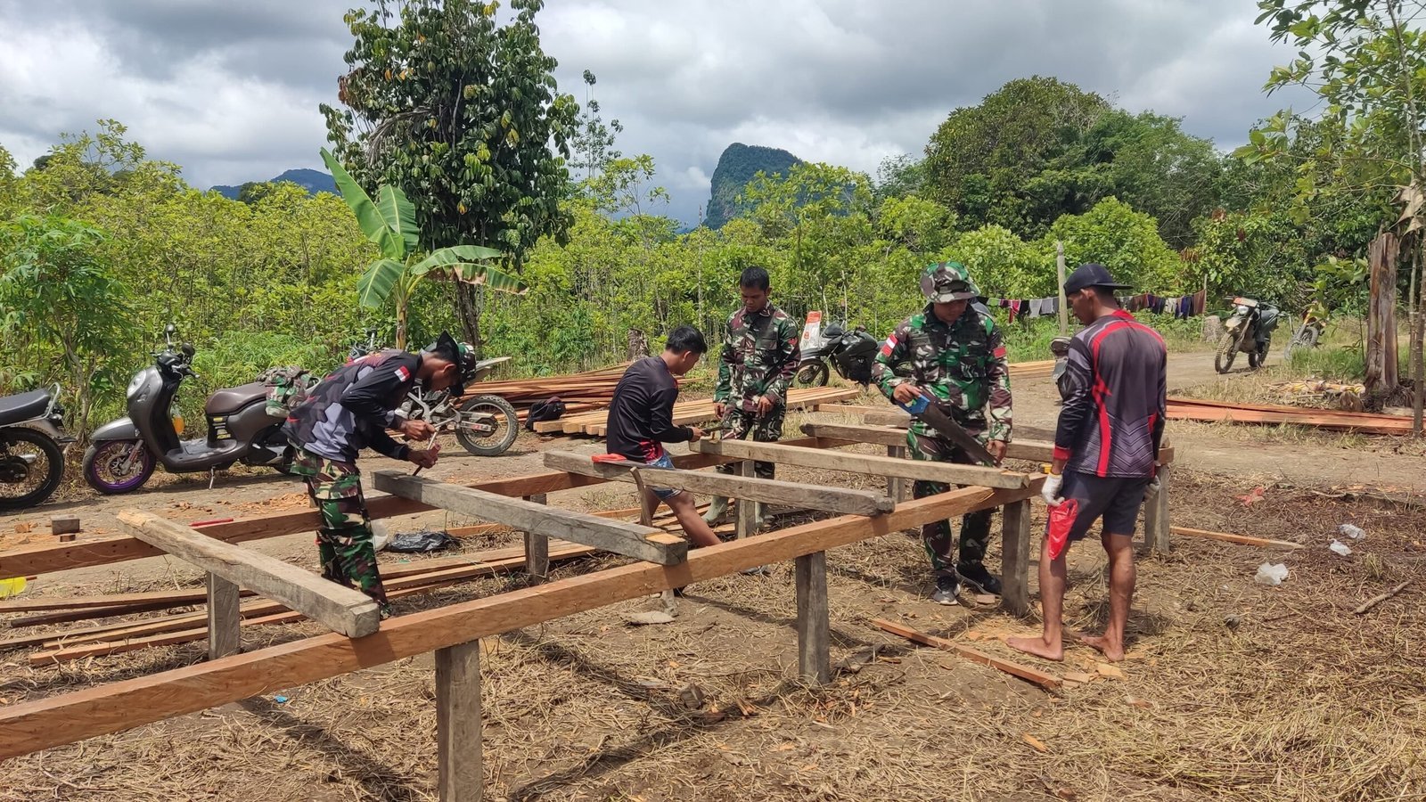 “Mumpung cuaca mendukung, kita bagi personel mulai dari penggalian lubang seftictank, penancapan tiang dan pemahatan kayu untuk pondasi bawah, mengingat waktu mulai berjalan,” lanjut DanSSK.