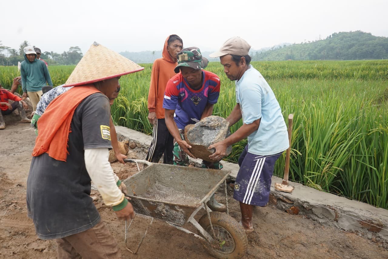 Keringat bercucuran, tangan penuh debu, namun wajah tetap tersenyum. Tak ada keluhan, yang ada hanya tekad bersama. Batu demi batu disusun rapi, menjadi dinding penahan yang kokoh — simbol kuatnya kebersamaan antara TNI dan masyarakat.