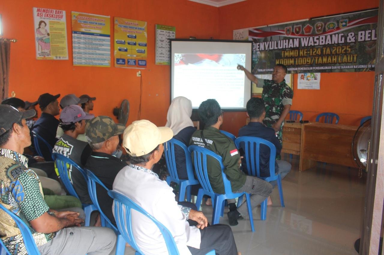 TANAH LAUT – Program TNI Manunggal Membangun Desa (TMMD) Reguler ke-124 Kodim 1009/Tanah Laut tahun 2025 di Desa Gunung Melati Kecamatan Batu Ampar, tidak hanya melaksanakan kegiatan yang bersifat fisik, akan tetapi juga melaksanakan kegiatan non fisik berupa penyuluhan Wawasan Kebangsaan (Wasbang) kepada masyarakat yang berada di sekitar lokasi TMMD, bertempat di Aula PKK Desa Gunung Melati, Kecamatan Batu Ampar, Rabu (07/05).