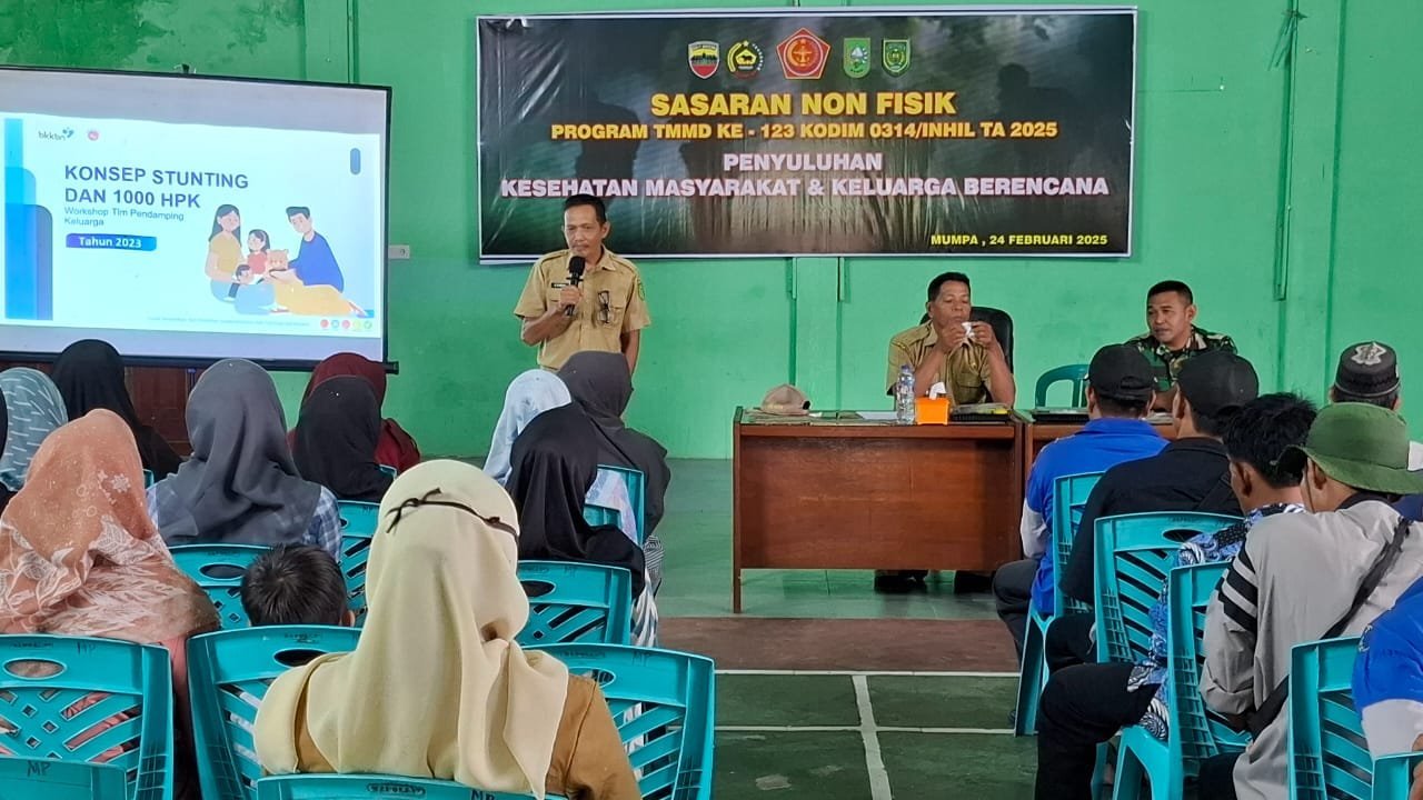 INHIL – Warga Desa Mumpa, Kecamatan Tempuling, menunjukkan antusiasme tinggi dalam mengikuti penyuluhan kesehatan masyarakat dan keluarga berencana (KB) yang digelar oleh Kodim 0314/Inhil bekerja sama dengan DP2KBP3A Kabupaten Indragiri Hilir (Inhil). Kegiatan ini merupakan bagian dari sasaran nonfisik program TNI Manunggal Membangun Desa (TMMD) ke-123, yang berlangsung di Gedung Serba Guna “Tuah Negeri” pada Senin (24/2/2025).