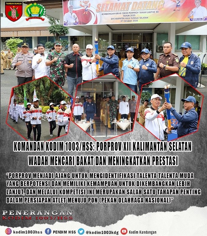 HULU SUNGAI SELATAN – Komandan Kodim 1003/Hulu Sungai Selatan (HSS) Letkol Inf Putut Januarto menjadi bagian tamu undangan VVIP bersama unsur Forkopimda dalam acara pemberangkatan Api Obor Pekan Olahraga Provinsi (Porprov) XII, dimana ditahun ini Kabupaten HSS kembali mendaptkan kehormatan menjadi titi api obor pertama setelah sebelumnya menjadi tuan rumah gelaran Porprov. Senin (27/10/25)