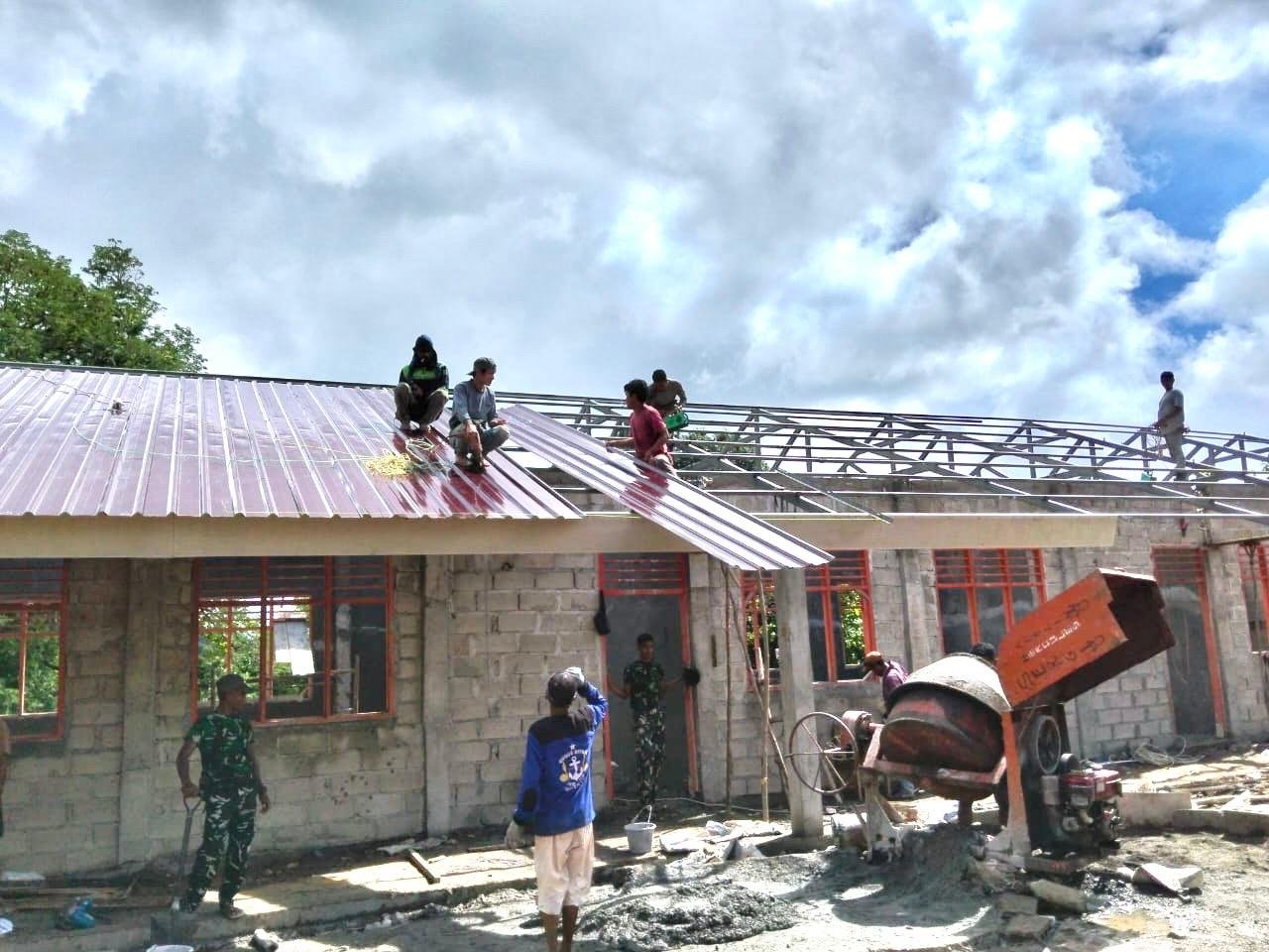 Tahapan pemasangan atap menjadi fase krusial dalam proses pembangunan. Dengan ketelitian tinggi, setiap lembar spandek dipasang rapi dan kuat guna memastikan perlindungan maksimal terhadap panas dan hujan yang kerap melanda wilayah perbatasan.