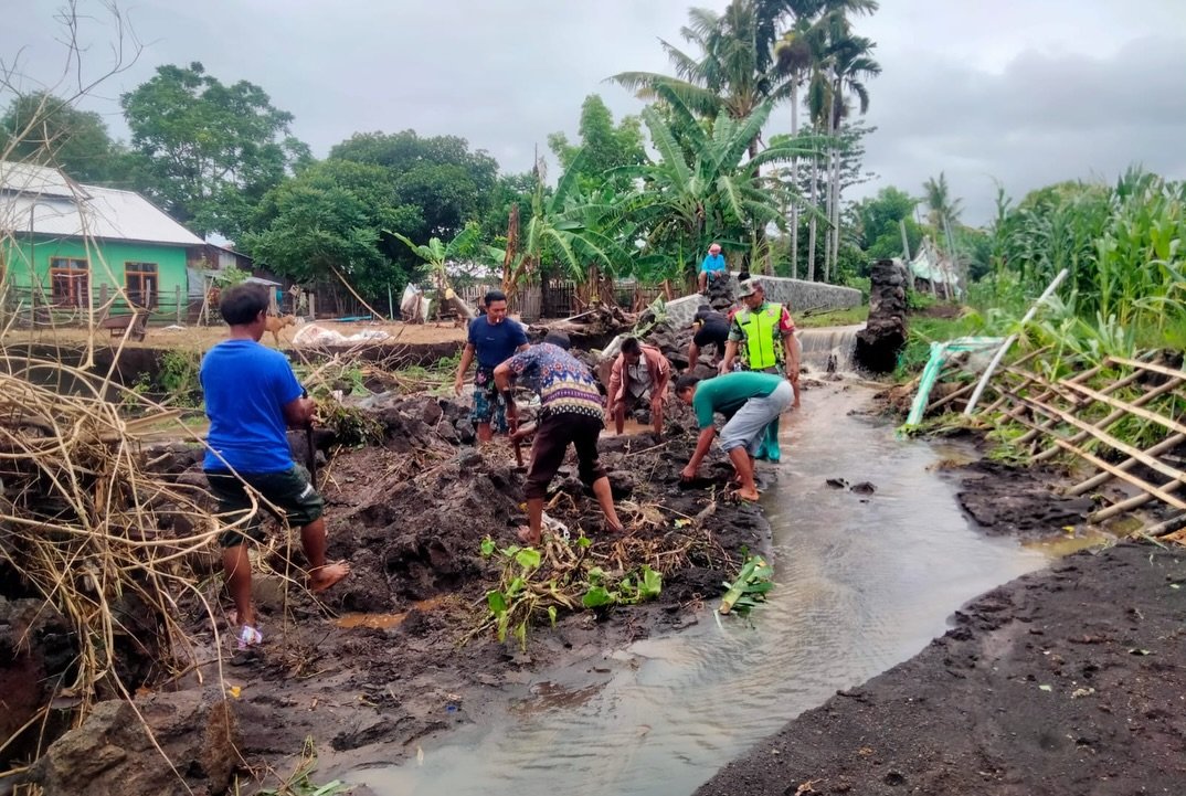 Sertu Herman, Babinsa 1608-05/Donggo yang bertugas di Desa Labuan Kananga, melaksanakan kegiatan gotong royong bersama warga setempat untuk menanggulangi ancaman banjir, Selasa (13/01/2026). Kegiatan ini difokuskan pada pengaturan jalur air dengan tujuan mencegah rumah-rumah warga roboh akibat jebolnya parit pembuangan air.