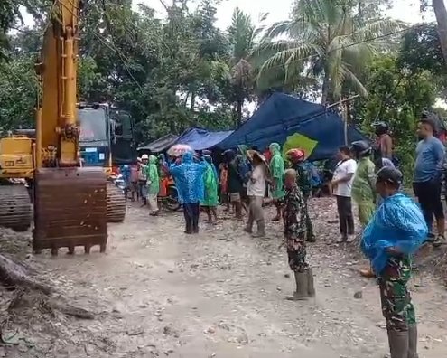 TTS – Curah hujan tinggi mengakibatkan terjadinya longsor hingga putusnya akses jalan, anggota Babinsa Koramil 1621-02 /Amanuban Tengah gerak cepat bantu warga yang menyebrangi tanah longsor.