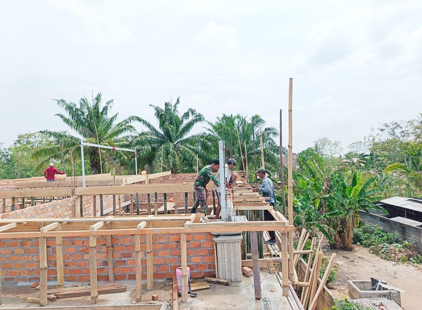 Praka Hardian selaku Babinsa bersama warga dan pemilik rumah, gotong royong mengerjakan pemasangan papan mal untuk pengecoran rumah.