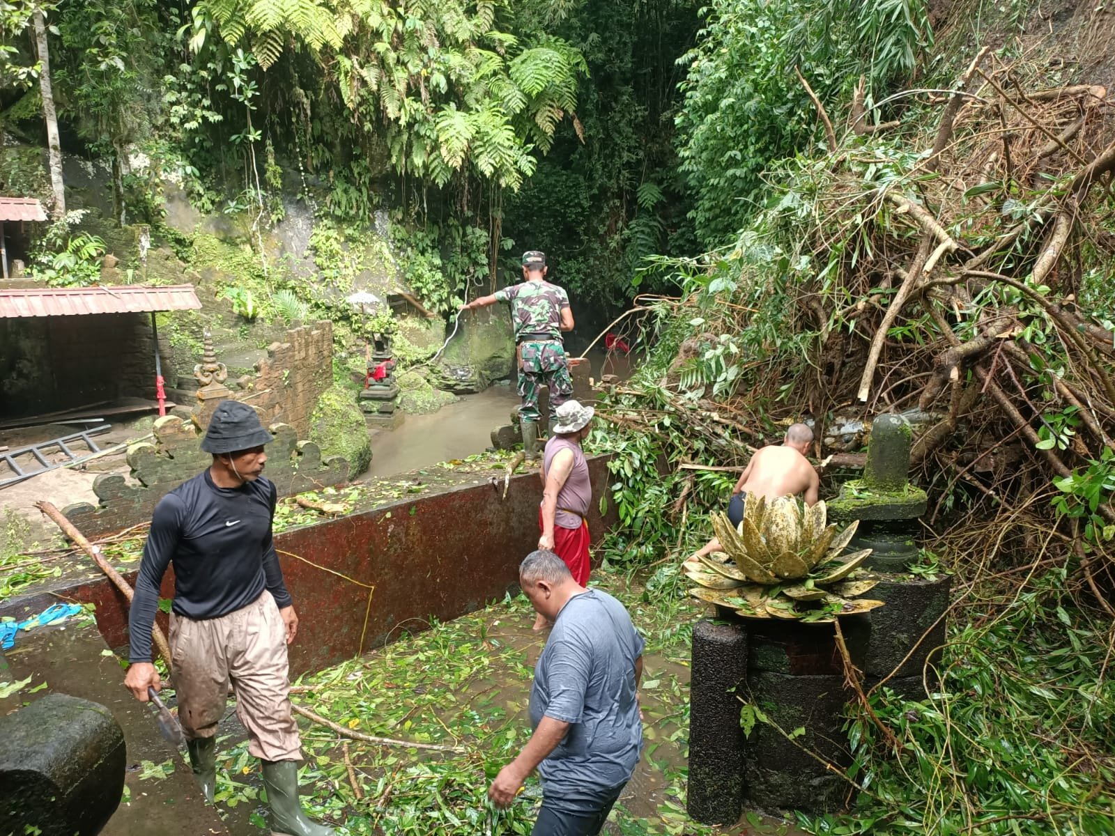 Bangli – Babinsa Desa Abuan Koramil 1626-02/Susut Kodim 1626/Bangli, Sertu I Dewa Gede Mertawan, bersama Pecalang Banjar Adat Sala melaksanakan kegiatan pembersihan tanah longsor yang disertai pohon tumbang dan menimpa Tempat Penglukatan di areal Pura Penglukatan Taman Pecampuhan, Banjar Adat Sala, Desa Abuan, Kecamatan Susut, Kabupaten Bangli, Sabtu ( 20/12/25 ).