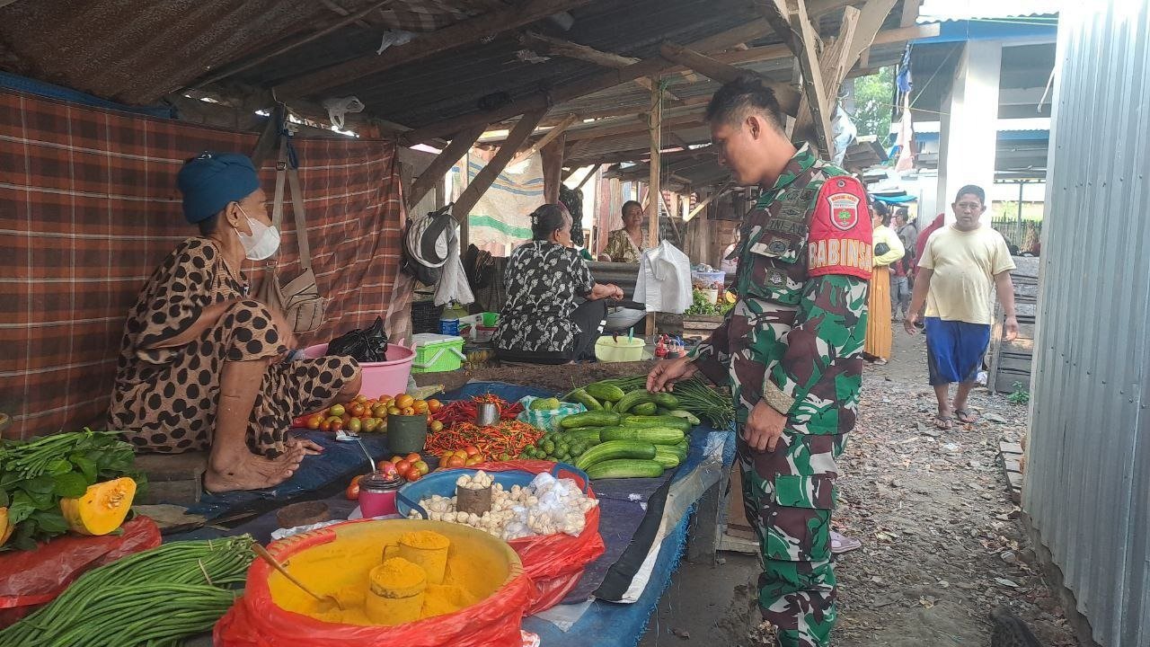 Sidrap – Babinsa Desa Allakuang Koramil 1420-03/Maritengngae, Serda Eman Rachman, melaksanakan kegiatan pemantauan ketersediaan dan harga bahan pokok di Pasar Tradisional Allakuang, Desa Allakuang, Kecamatan Maritengngae, Kabupaten Sidrap, Senin (18/08/25).