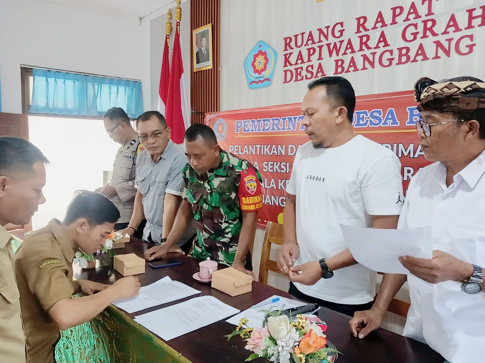 Babinsa Desa Bangbang Pelda Kadek Widiarta mengatakan Serah terima dan pengambilan sumpah jabatan Kasi Kesra Desa Bangbang dan kelian dinas Bangbang dilingkungan pemerintahan Desa Bangbang dilaksanakan karena pejabat lama telah memasuki masa purna tugas pada akhir Desember tahun 2024.