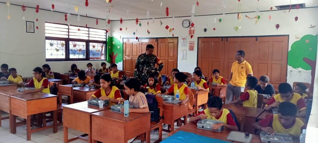 NTT-KUPANG, – Dalam rangka mendukung program Asta Cita, Babinsa Kelurahan Fatululi, Sertu La Dane, bersama Badan Gizi Nasional (BGN), turut serta menyalurkan makanan bergizi gratis di SDN Oebobo 1, Kelurahan Fatululi, Kecamatan Oebobo, Kota Kupang. Kegiatan ini bertujuan untuk mendukung pemenuhan gizi bagi para siswa, dengan total 186 porsi makanan yang dibagikan. Jumat (21/02/2025).