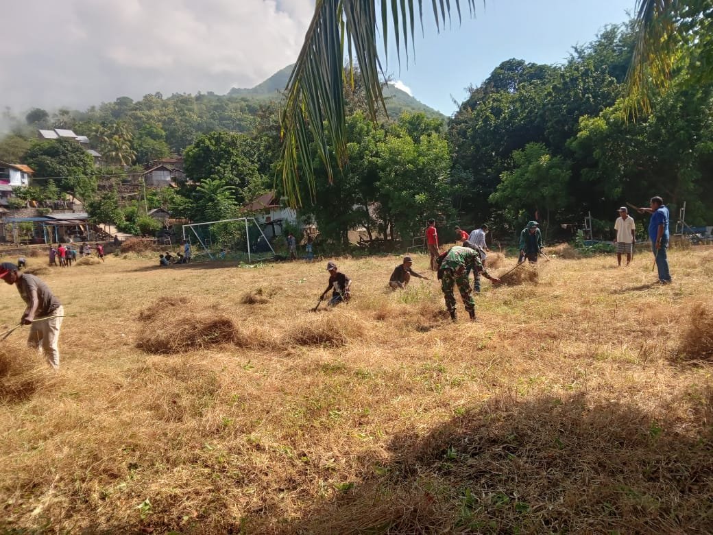 Dikatakan Sertu Edison pelaksanaan karya bakti anggota Koramil bersama masyarakat dengan sasaran pembersihan semak belukar di sekitar lapangan.