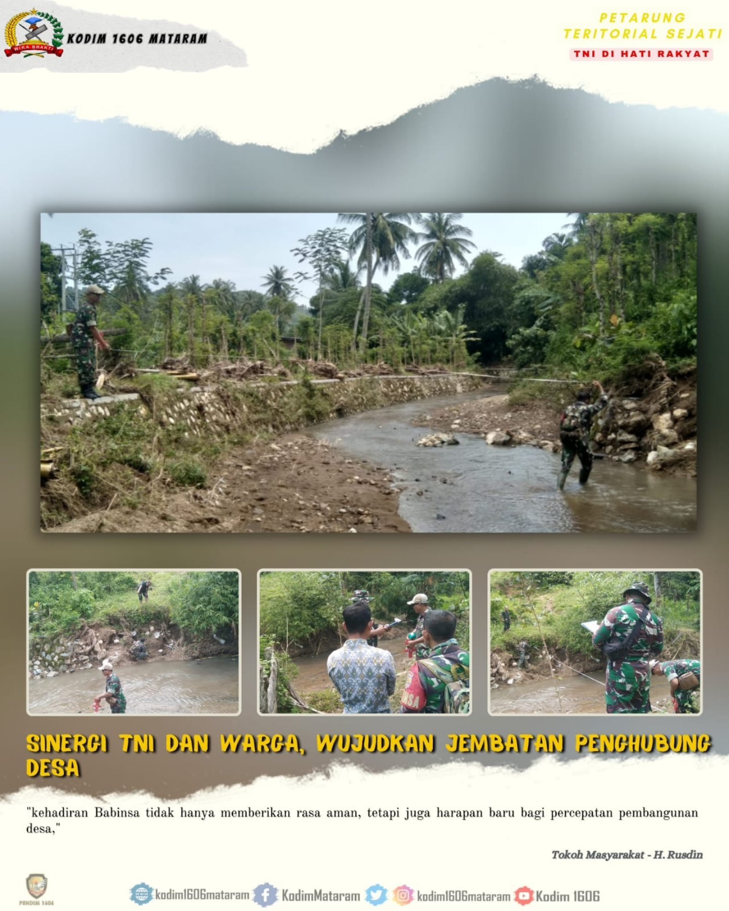 Kegiatan yang berlokasi di Sungai Bakar Tumbuk, Dusun Kebeng, Desa Persiapan Pengantap, Kecamatan Sekotong, Kabupaten Lombok Barat, wilayah teritorial Komando Distrik Militer (Kodim) 1606/Mataram. Pengecekan dilakukan bersama Tim Zeni Bangunan (Zibang) sebagai langkah awal untuk memastikan kelayakan pembangunan jembatan demi memperlancar akses transportasi dan aktivitas warga.
