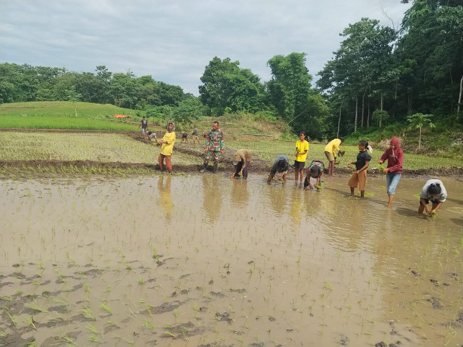 SUMBA TENGAH – Babinsa Koramil 03/Katikutana Kodim 1613/Sumba Barat, Serka Masrin, melaksanakan komunikasi sosial (komsos) ketahanan pangan bersama warga dengan membantu kegiatan tanam padi di Desa Malinjak, Kecamatan Katikutana Selatan, Kabupaten Sumba Tengah, Kamis (22/01/2026).