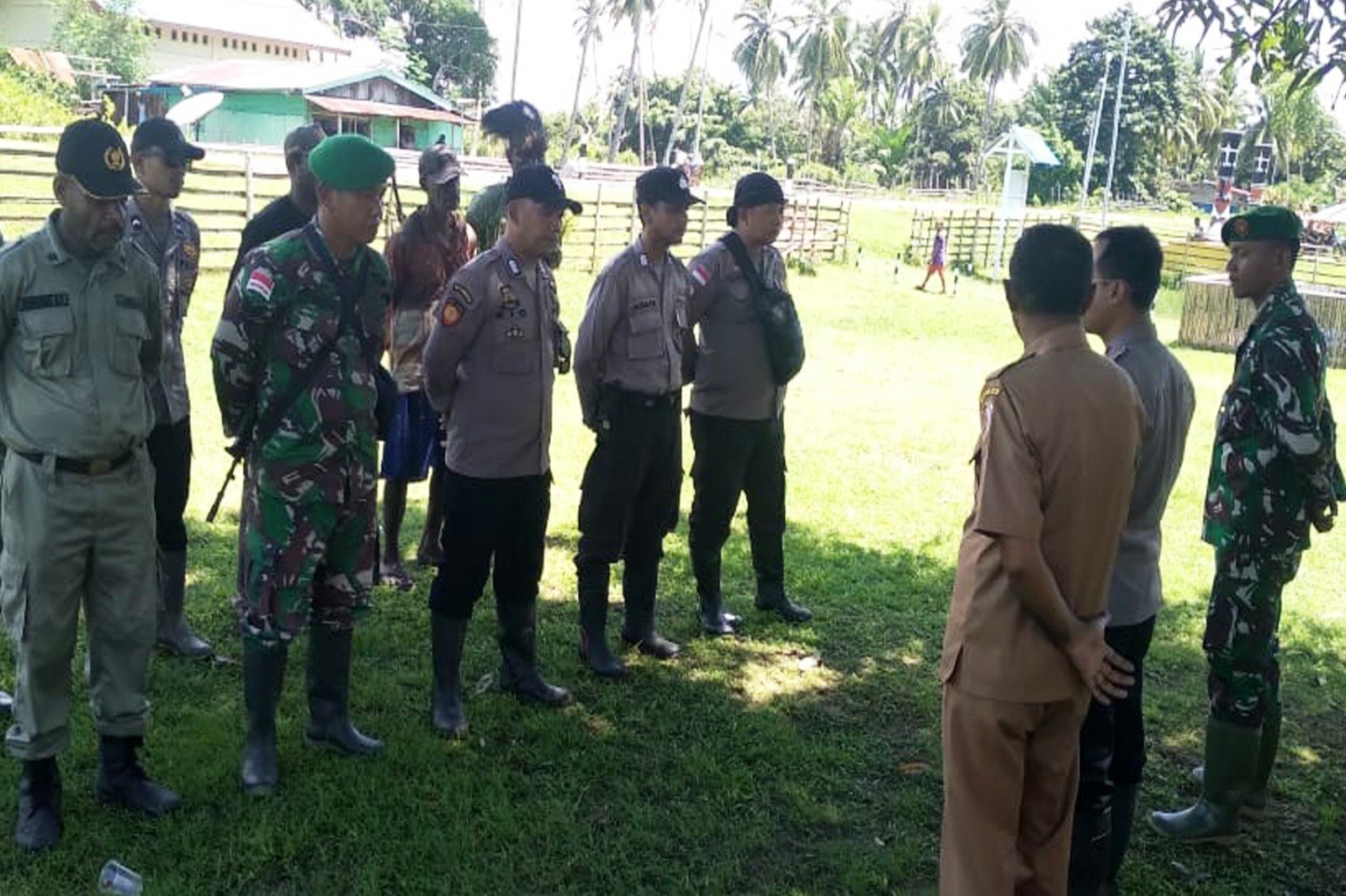 Babinsa Koramil 1707-03/Okaba yang dipimpin oleh Danpos Ramil Distrik Ngguti Koramil 1707-03/Ikaba Pelda Bahrun Rajab bersama Bhabinkamtibmas Polsek Okaba melaksanakan apel gabungan dalam rangka persiapan patroli pengamanan pergantian tahun di wilayah Distrik Okaba Kabupaten Merauke – Provinsi Papua Selatan.