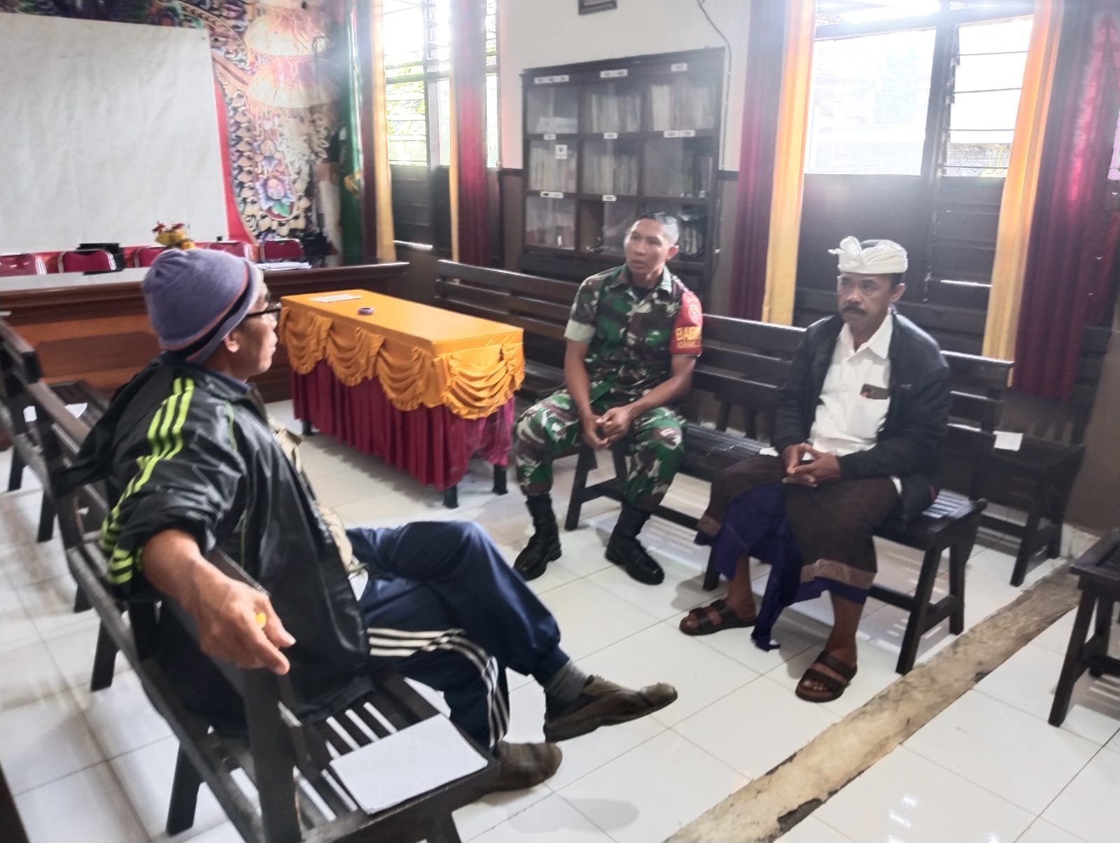 Bangli – Babinsa Koramil 1626-02/Susut, Sertu I Gede Sukadana, melaksanakan kegiatan komunikasi sosial (komsos) bersama Penyuluh Pertanian Lapangan (PPL) dan kepala desa di Desa Demulih, Kecamatan Susut, Kabupaten Bangli, Komsos tersebut demi meningkatkan hasil pertanian dan sinergitas antara pendamping pertanian. Jumat (3/1/25).
