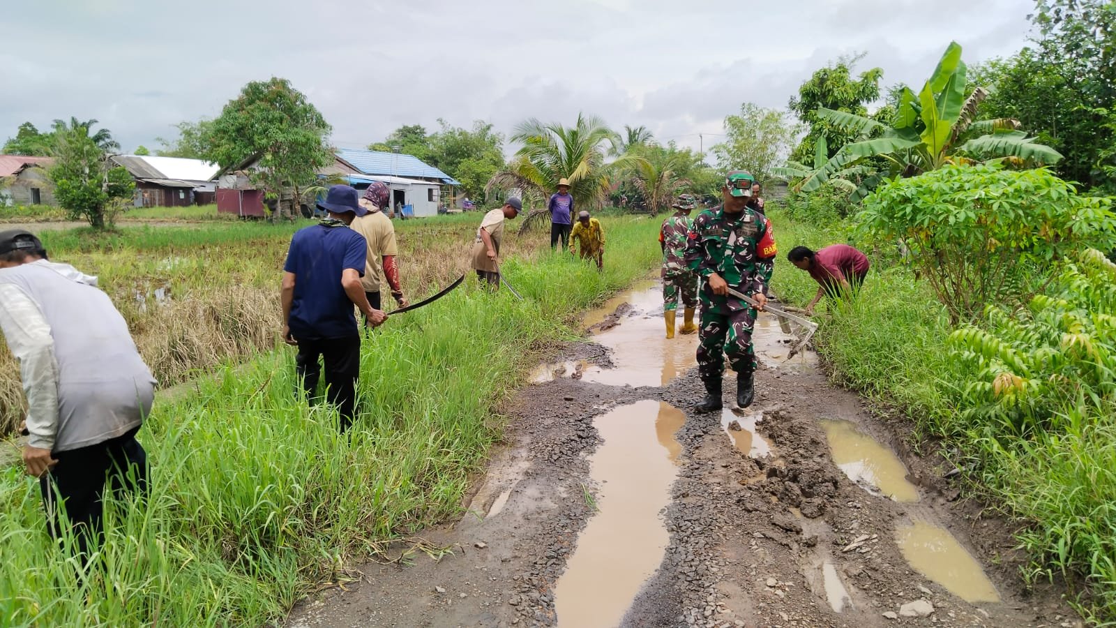 Sertu Joni selaku Babinsa setempat tidak hanya hadir sebagai pengawas, tetapi ikut turun tangan bersama warga. Tanah demi tanah ditimbun, sementara sisi kanan dan kiri jalan dibersihkan dari rerumputan agar akses menjadi lebih aman dan nyaman dilalui.