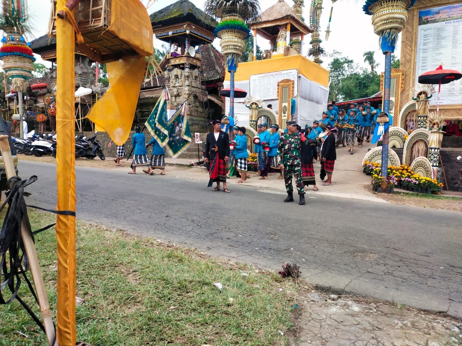 Bangli – Sebagai wujud kepedulian dan kemanunggalan TNI dengan rakyat, Babinsa Desa Kayubihi, Koramil 01/Bangli Kodim 1626/Bangli, Serka I Wayan Suastika, bersama pecalang Desa Adat Kayang melaksanakan pengamanan upacara Nyineb Ida Sesuhunan di Pura Puseh Tempek Tengah, Minggu (28/9/2025).