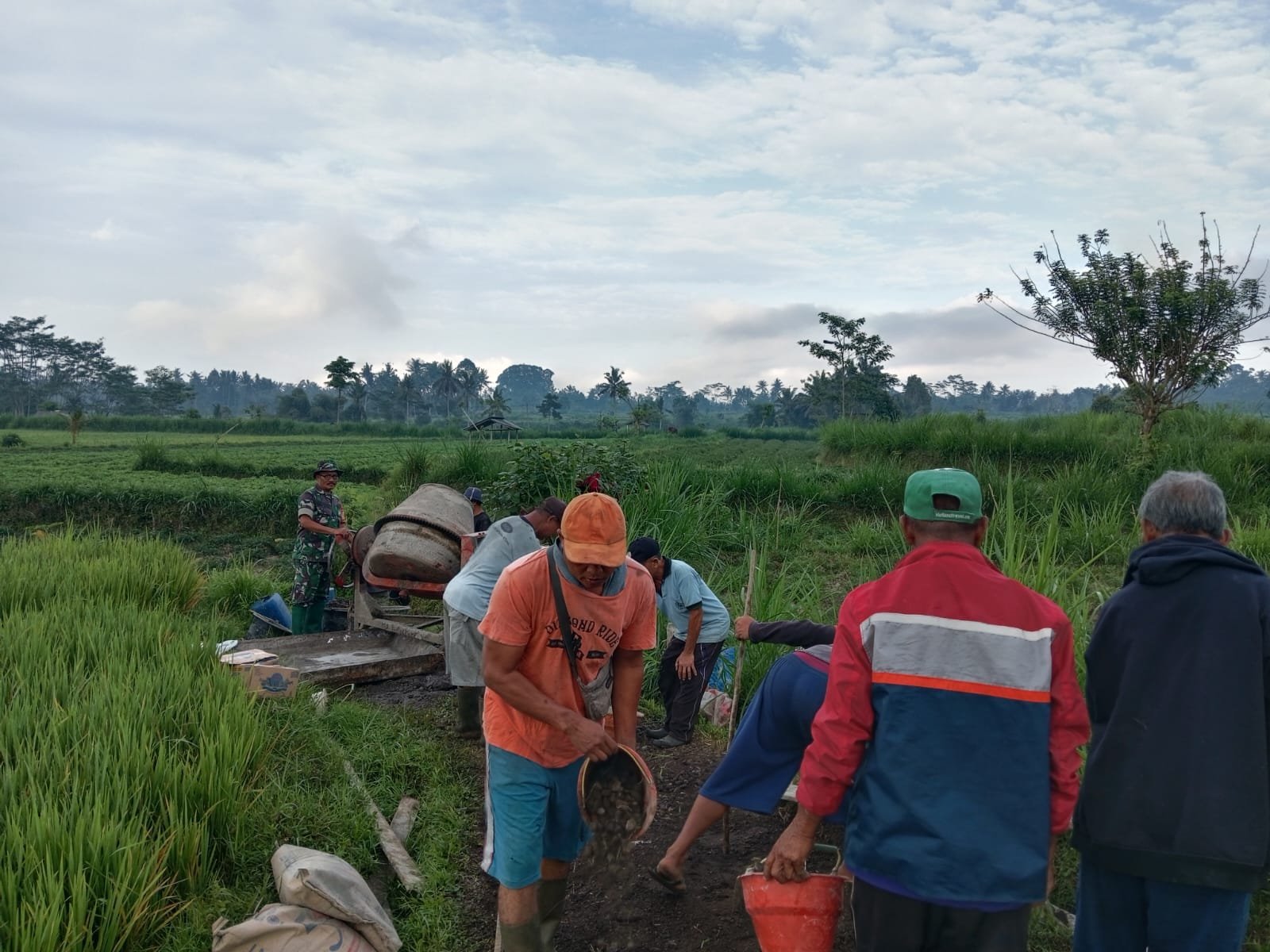 Bangli – Babinsa Desa Peninjoan Koramil 1626-03/Tembuku, Sertu I Made Suarnika, bersama masyarakat Subak Puluai melaksanakan kegiatan gotong royong pembuatan rambat beton jalan usaha tani yang menghubungkan Subak Puluai dengan Subak Payuk, Banjar Tampuagan, Desa Peninjoan, Kecamatan Tembuku, Bangli. minggu (28/09/2025)