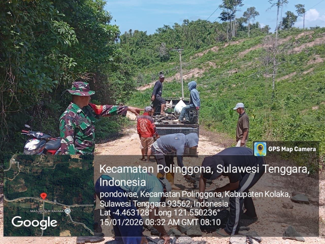 Kegiatan kerja bakti tersebut dilaksanakan di Desa Pondowae, Kecamatan Polinggona, Kabupaten Kolaka. Perbaikan jalan ini bertujuan untuk meningkatkan akses transportasi warga serta menunjang kelancaran aktivitas masyarakat sehari-hari.