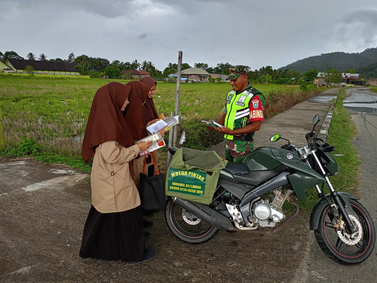 Kegiatan tersebut dilaksanakan di Desa Meunasah Weh, Kecamatan Jaya. Di sela waktu istirahat belajar, Babinsa mengunjungi para siswa dengan membawa motor pintar yang berisi berbagai buku pengetahuan.