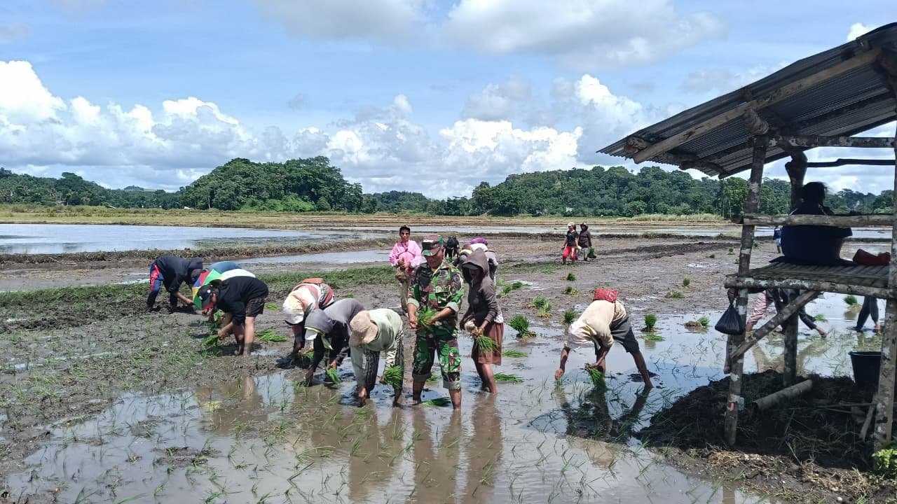 SUMBA TENGAH – Dalam rangka mendukung program ketahanan pangan di wilayah binaan, Babinsa Koramil 03/Katikutana Kodim 1613/Sumba Barat, Serma Suherman, melaksanakan komunikasi sosial (Komsos) dengan membantu warga menanam padi di Desa Makatakeri, Kecamatan Katikutana, Kabupaten Sumba Tengah, Minggu (04/01/2026).