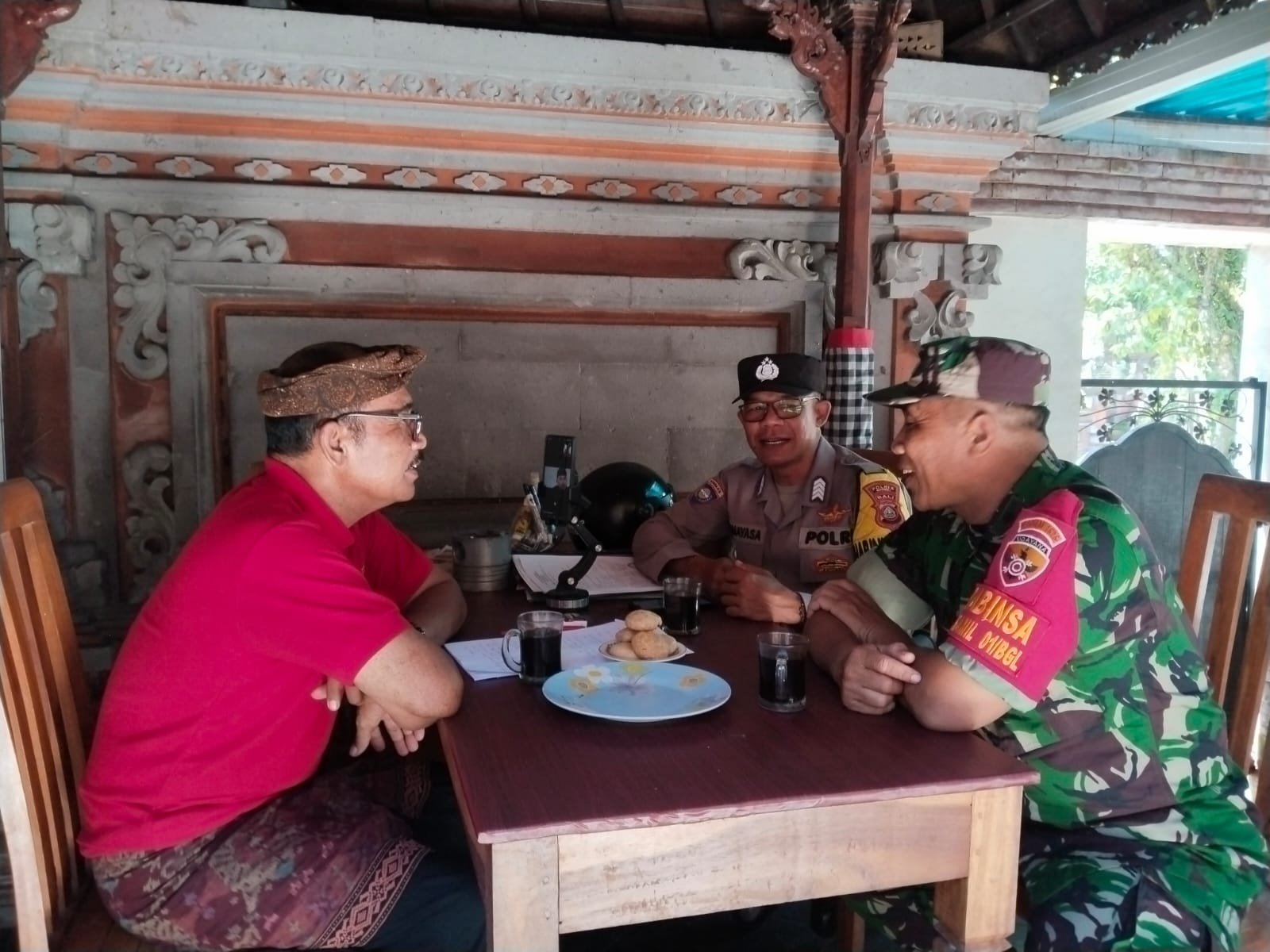 Bangli – Menjelang perayaan Hari Raya Nyepi Caka 1947, Babinsa Desa Bunutin, Koramil 01/Bangli, Kodim 1626/Bangli, Peltu I Ketut Udayana bersama Bhabinkamtibmas Desa Bunutin, Polsek Bangli, Bripka I Nyoman Padmayana melaksanakan koordinasi dengan Bendesa Adat Guliang Kawan, Sang Nyoman Peria, guna membahas persiapan serta pengamanan pengarakan ogoh-ogoh saat pengerupukan bertempat di Banjar Adat Guliang Kawan, Kecamatan Bangli. Senin (03/03/25).