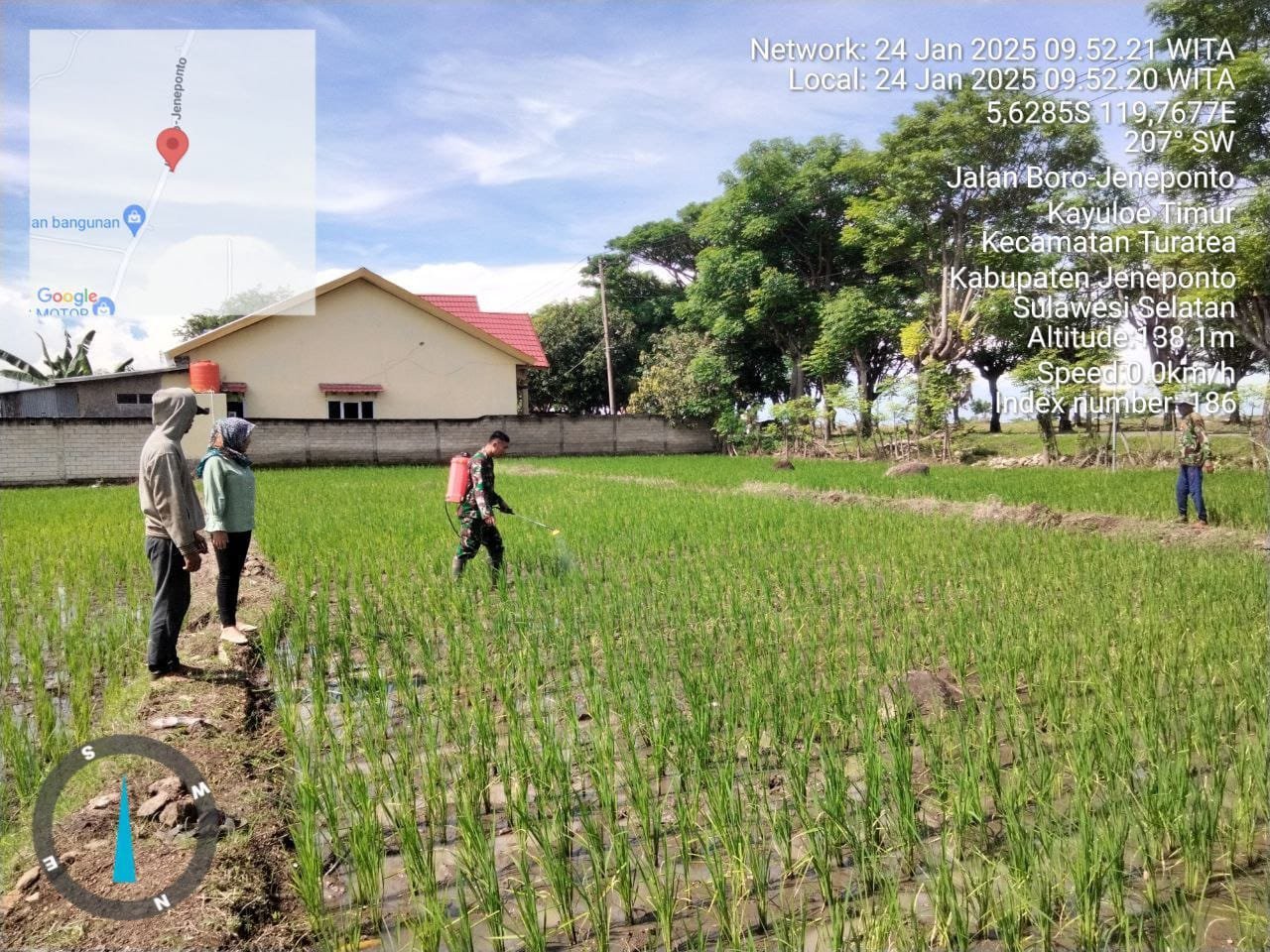 Sertu Syarifin terjun langsung ke sawah membantu para petani dalam kegiatan penyemprotan hama tanaman padi di Lahan milik Bapak Dulimang warga Dusun Ujung Bori, Desa Kayuloe Timur, Kecamatan Turatea, Kabupaten Jeneponto pada Jumat 24/01/25.
