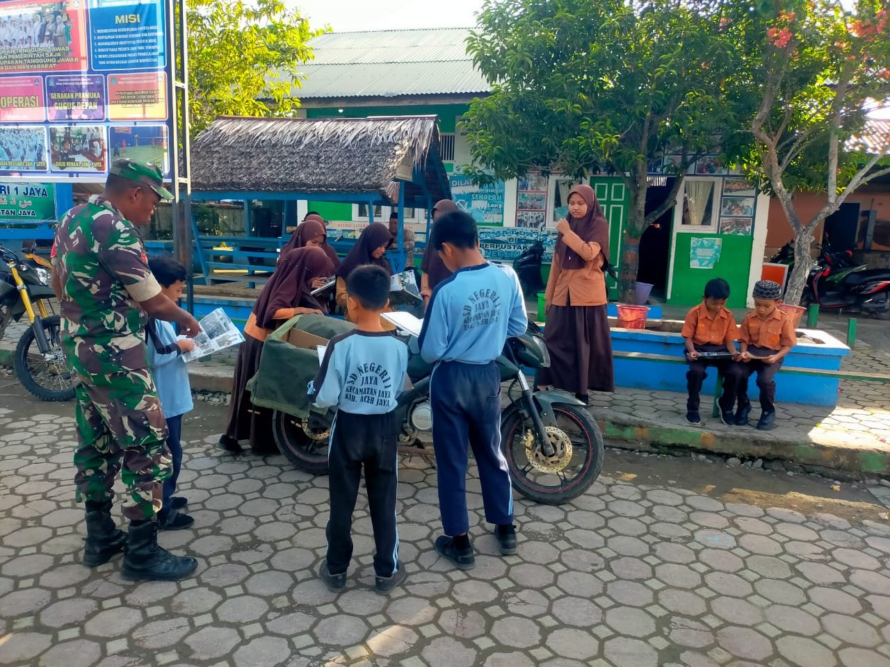 ACEH JAYA – Semangat mencerdaskan bangsa terus digaungkan oleh jajaran TNI di lini terdepan. Komando Rayon Militer (Koramil) 01/Jaya Kodim 0114/Aceh Jaya melalui Babinsanya, Kopral Kepala (Koptu) Rahmat Putra, sukses menyelenggarakan program inovatif “Motor Pintar” yang menyasar siswa-siswi Sekolah Dasar Negeri (SDN) 1 Jaya, bertempat di Desa Pasar Lamno, Kecamatan Jaya, Kabupaten Aceh Jaya.