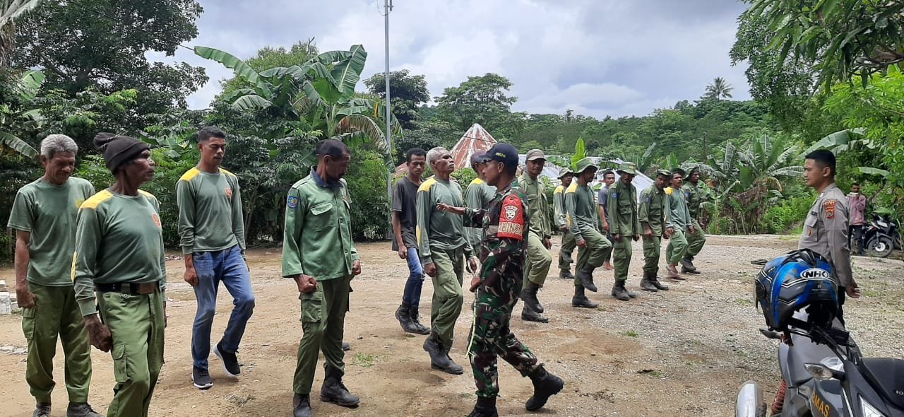 SoE |Anggota Babinsa Koramil 01/Kota SoE, Serda Nyongsri Faot bersama Babinkamtibmas Memberikan pelatihan PBB dan Wawasan Kebangsaan (Wasbang) kepada sejumlah Linmas di Desa Enoneontes, Kecamatan Noebeba, Kabupaten Timor Tengah Selatan (TTS).