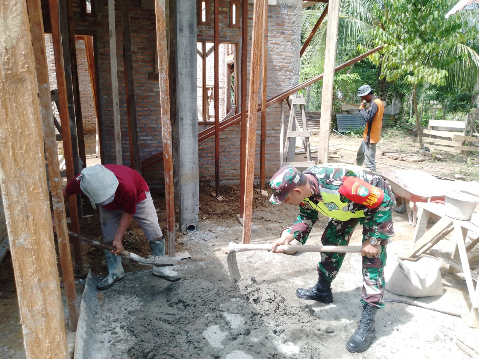 ACEH BARAT – Berperan Aktif, Babinsa Koramil 01/Sungaimas Kodim 0105/Abar, Koptu Zakir, membantu mengaduk semen untuk mengecor lantai rumah milik salah satu warga di Desa Geudong, Kecamatan Sungaimas, Kabupaten Aceh Barat, pada Rabu (2/7/2025).