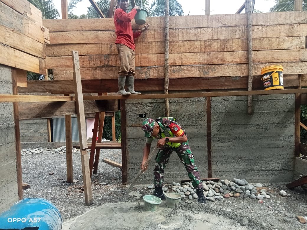 ACEH BARAT – Dalam rangka mempercepat pembangunan rumah warga, Babinsa Koramil 01/Sungaimas Kodim 0105/Abar, Serda M. Irwandi, turut membantu warga desa dengan terlibat langsung dalam proses pengadukan semen untuk pengecoran dinding rumah milik salah satu warga di Desa Kajeng, Kecamatan Sungaimas, Kabupaten Aceh Barat, Sabtu (15/11/2025).