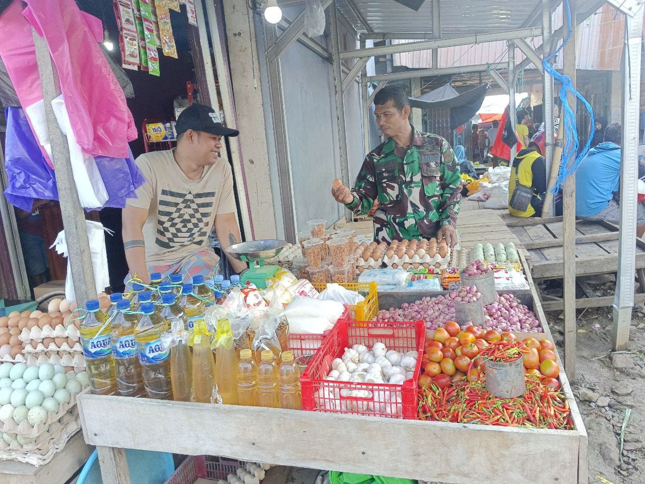 Kegiatan ini dilakukan guna memastikan kebutuhan dasar masyarakat tetap terpenuhi dengan harga yang wajar, serta mengantisipasi terjadinya lonjakan harga atau kelangkaan barang di tengah dinamika pangan saat ini. Selama pemantauan, Serka Anwar Rore melakukan pengecekan terhadap berbagai komoditi utama seperti beras, minyak goreng, gula pasir, telur, daging ayam, dan sayur-mayur, serta berdialog dengan para pedagang untuk mengetahui kondisi distribusi dan pasokan barang.