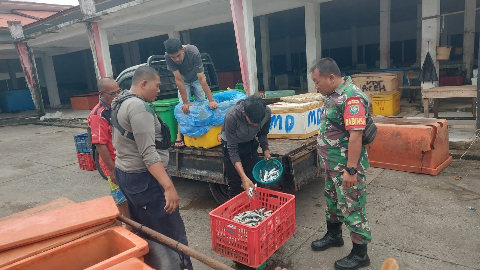 Aceh Jaya – Dalam rangka mengetahui kondisi ekonomi masyarakat pasca lebaran, Babinsa Koramil 04/Krueng Sabee Kodim 0114/Aceh Jaya, Sertu Kusmonp, melaksanakan komunikasi sosial (komsos) dengan pedagang ikan di Pasar Ikan Calang, Desa Gampong Blang, Kecamatan Krueng Sabee, Senin (tanggal menyesuaikan).