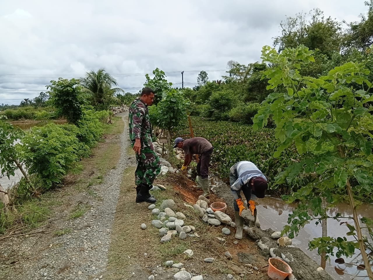 ACEH BARAT — Sertu Agustino, Babinsa Koramil 07/Johan Pahlawan Kodim 0105/Aceh Barat, melaksanakan kegiatan gotong royong pembuatan talud jalan menuju persawahan warga di Desa Kampung Darat. Kegiatan ini bertujuan untuk memperbaiki infrastruktur jalan dan memudahkan akses warga ke persawahan, Kamis (20/11/2025).