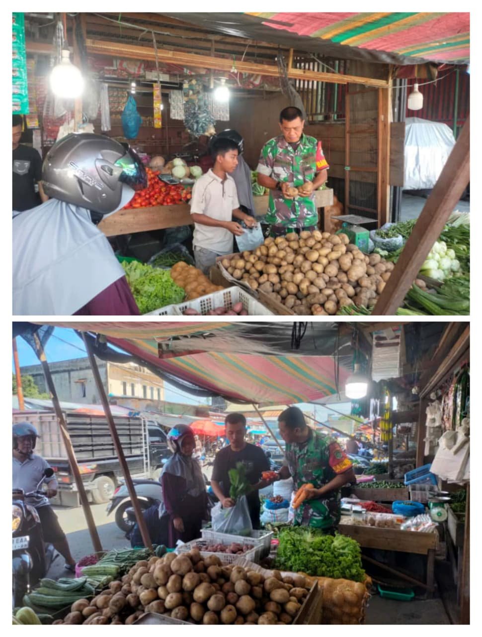 ACEH BARAT – Sertu Agustino, Babinsa Koramil 07/Johan Pahlawan, Kodim 0105/Aceh Barat, memantau kebutuhan pokok di Pasar Bina Usaha Meulaboh, Desa Ujung Baroh, Jumat (2/1/2025).