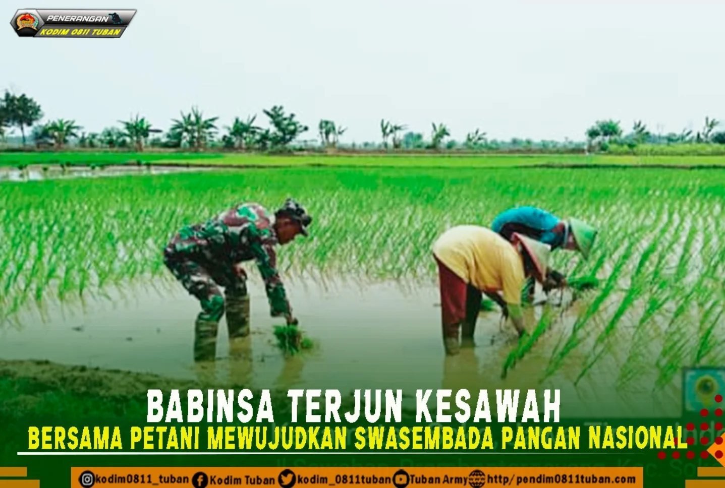 TUBAN, – Babinsa Koramil 0811/05 Rengel Sertu Kasminto terjun ke sawah mendampingi dan membantu tanam padi bersama petani mewujudkan swasembada pangan nasional di Desa Sumberjo, Kecamatan Rengel, Kabupaten Tuban, Minggu (19/01/ 2025).