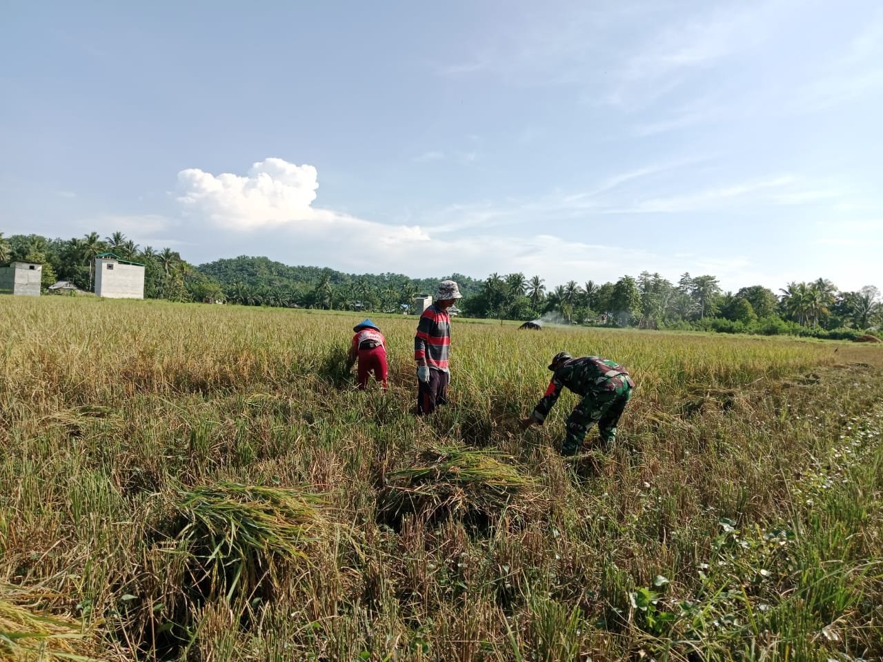 Wujud dukungan TNI khususnya prajurit kewilayahan yaitu Babinsa dalam mendukung ketahanan pangan, dengan semangat ikut serta terjun langsung ke sawah bantu para petani desa binaannya saat memanen padi, inilah yang dilakukan oleh Babinsa kepada para petani warga desa binaannya.