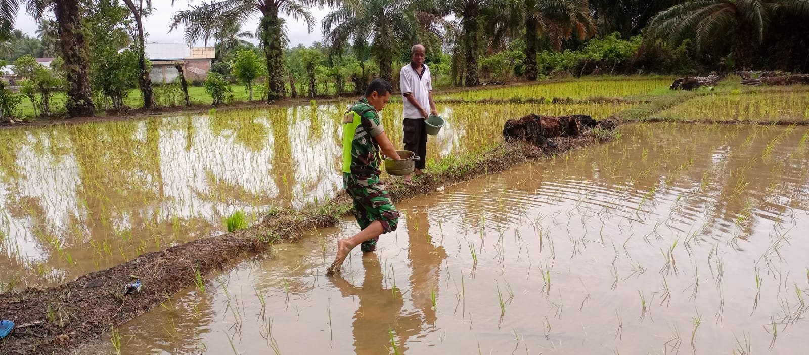 ACEH BARAT — Dalam upaya memperkuat ketahanan pangan dan meningkatkan produktivitas pertanian masyarakat, Babinsa Koramil 09/Samatiga, Sertu Puguh Purnomo, kembali menunjukkan komitmen nyata melalui kegiatan pendampingan terhadap Kelompok Tani dalam giat pemupukan tanaman padi di Desa Pinem, Kecamatan Samatiga, Kabupaten Aceh Barat. Senin (14/7/2025)