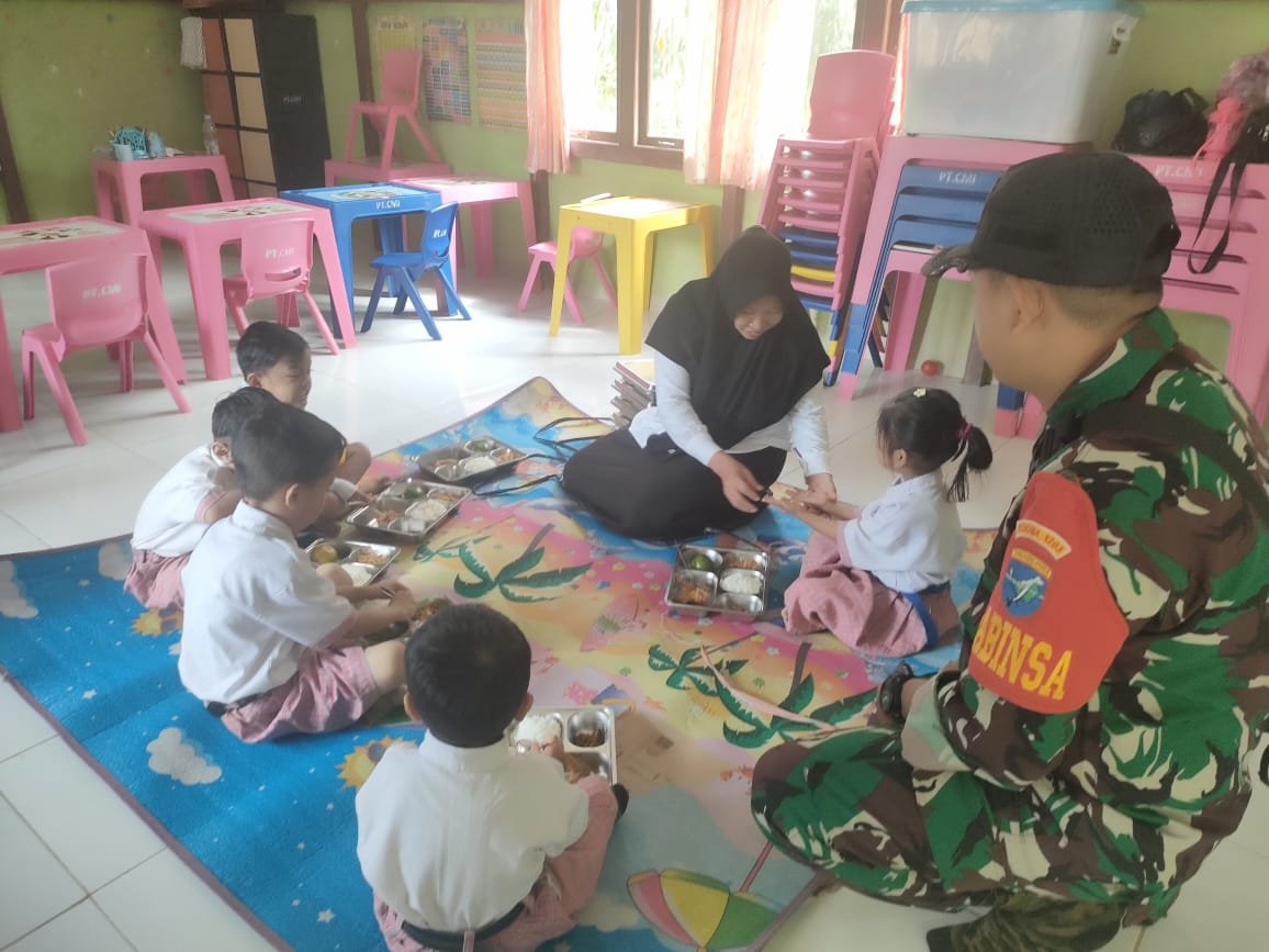 KETAPANG – Dalam rangka mendukung program pemerintah dalam peningkatan gizi anak usia dini, Babinsa Koramil 10/Sandai jajaran Kodim 1203/Ketapang, Sertu Sumadi, melaksanakan pendampingan dan pengawasan kegiatan Makan Bergizi Gratis (MBG) yang digelar di TK Bhayangkari, Kecamatan Sandai, Kabupaten Ketapang, Senin (06/10/2025) .