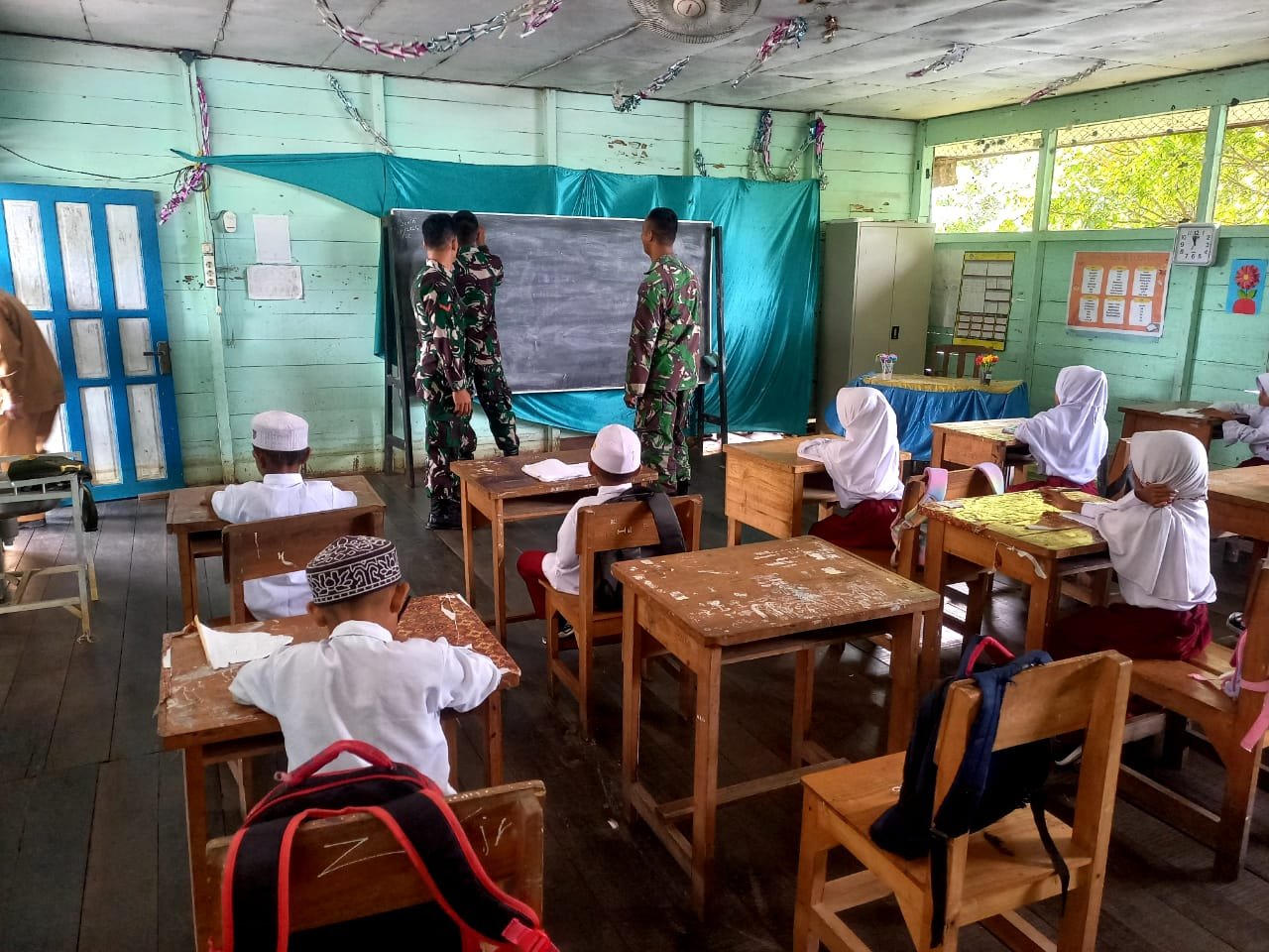 Hulu Sungai Utara – Di SDN Desa Danau Teratai, Kecamatan Banjang, Kabupaten Hulu Sungai Utara, Babinsa Koramil 1001-07/Amuntai Tengah yang dipimpin oleh Sertu Mukmin melaksanakan pemberian materi matematika kepada para siswa-siswi, Senin (10/03/2025).