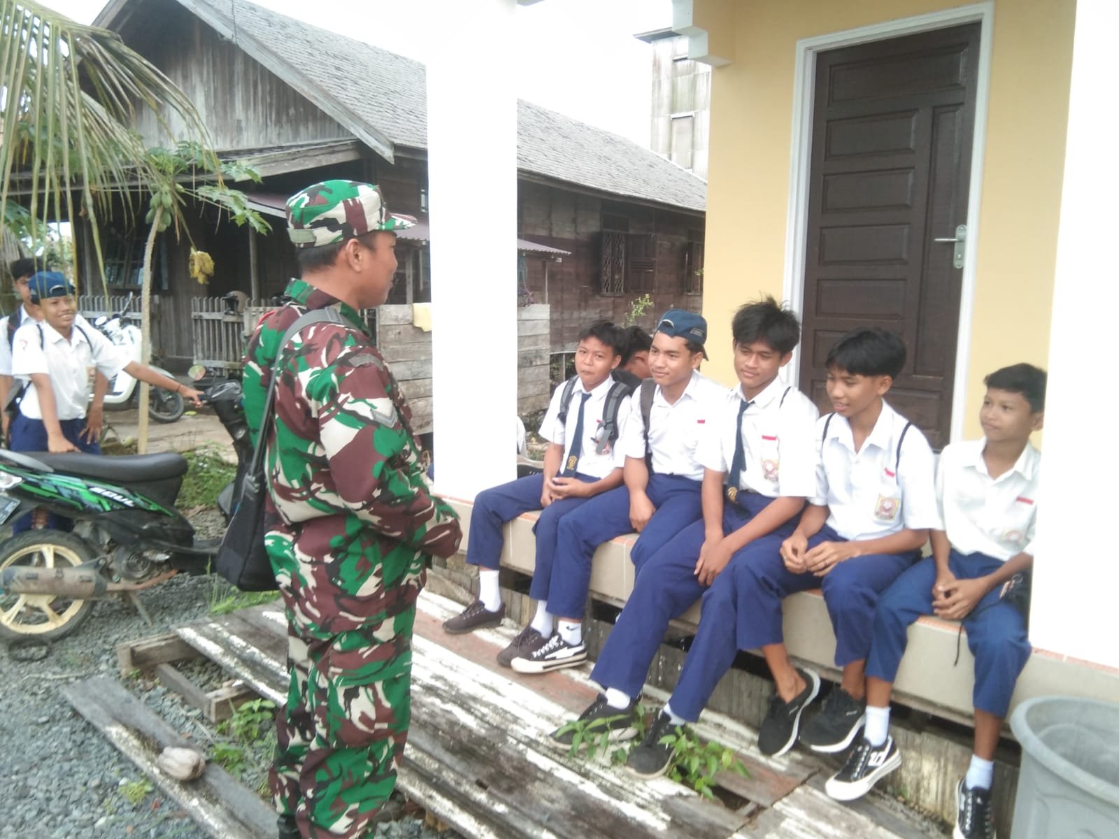 Kegiatan berlangsung di area terbuka sekolah, di mana para siswa tampak antusias menyimak arahan dan berbincang santai dengan Babinsa. Interaksi tersebut mencerminkan pendekatan humanis yang dilakukan TNI dalam membina masyarakat.