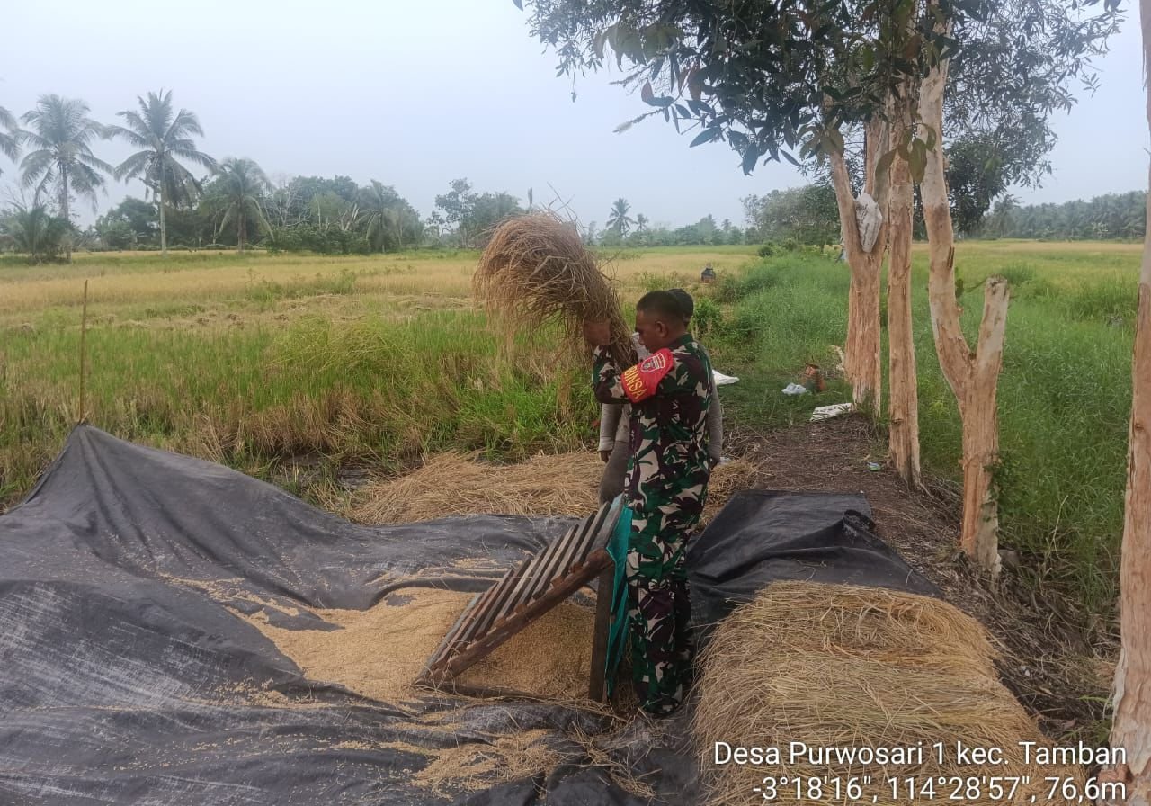 Barito Kuala, Kalimantan Selatan – Babinsa Koramil 1005-10/Tamban Serda Sumardi, melaksanakan kegiatan pendampingan hanpangan (ketahanan pangan) bersama para petani dengan membantu proses perontokan padi pasca panen. Kegiatan ini berlangsung di Desa Puwosari, Kecamatan Tamban, Kabupaten Barito Kuala, pada Kamis (29/08/2025).