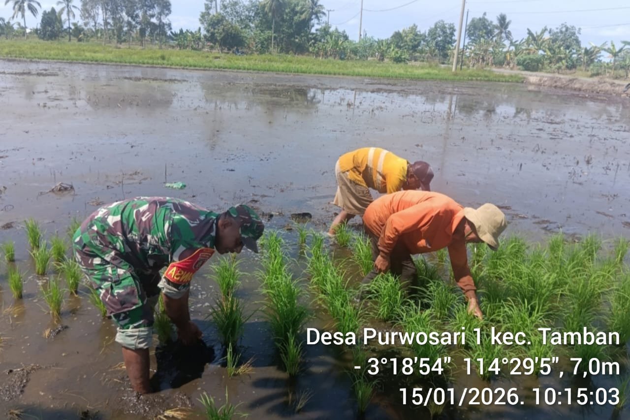 Barito Kuala — Dalam upaya mendukung ketahanan pangan nasional dan memperkuat sinergi antara TNI dan masyarakat, Babinsa Koramil 1005-10/Tamban Serda Sumardi, melaksanakan kegiatan pendampingan Luas Tambah Tanam (LTT) dengan turun langsung ke sawah membantu petani menanam padi. Kegiatan ini berlangsung di Desa Purwosari, Kecamatan Tamban, Kabupaten Barito Kuala, Kalimantan Selatan. Pada Kamis 15 Januari 2026.