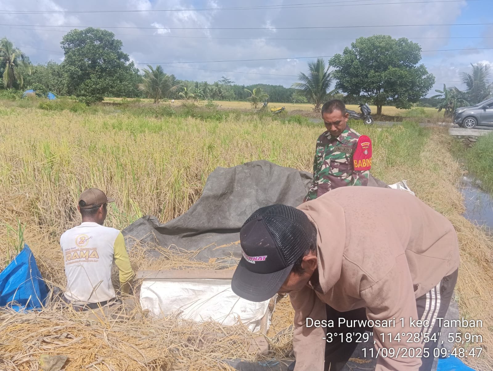 Barito Kuala, Kalimantan Selatan – Serda Sumardi, seorang Bintara Pembina Desa (Babinsa) dari Komando Rayon Militer (Koramil) 1005-10/Tamban/Mekarsari, menunjukkan komitmennya dalam mendukung sektor pertanian dengan terjun langsung mendampingi petani dalam kegiatan panen. Kegiatan pendampingan kali ini dilaksanakan di Desa Purwosari, Kecamatan Tamban, Kabupaten Barito Kuala, pada hari Kamis, 11 September 2025.